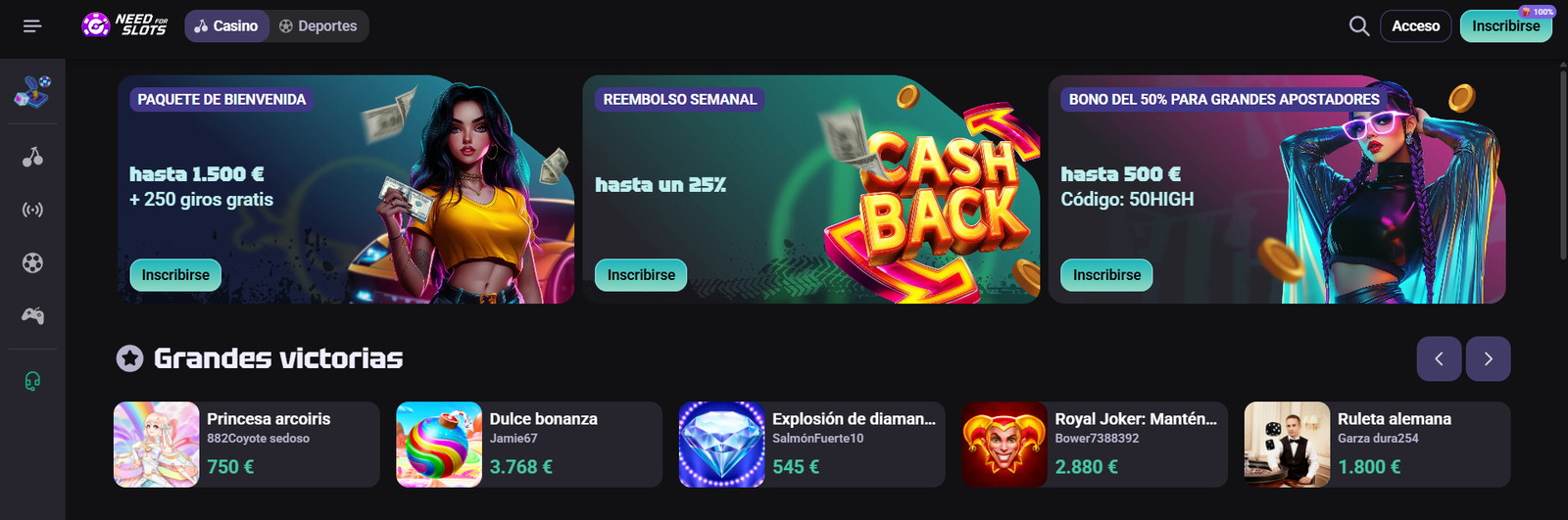 At Casino NeedForSlots, some exclusive 100% games are available. These are not only unavailable at other Spanish casinos, but they also offer modern and thrilling gameplay.